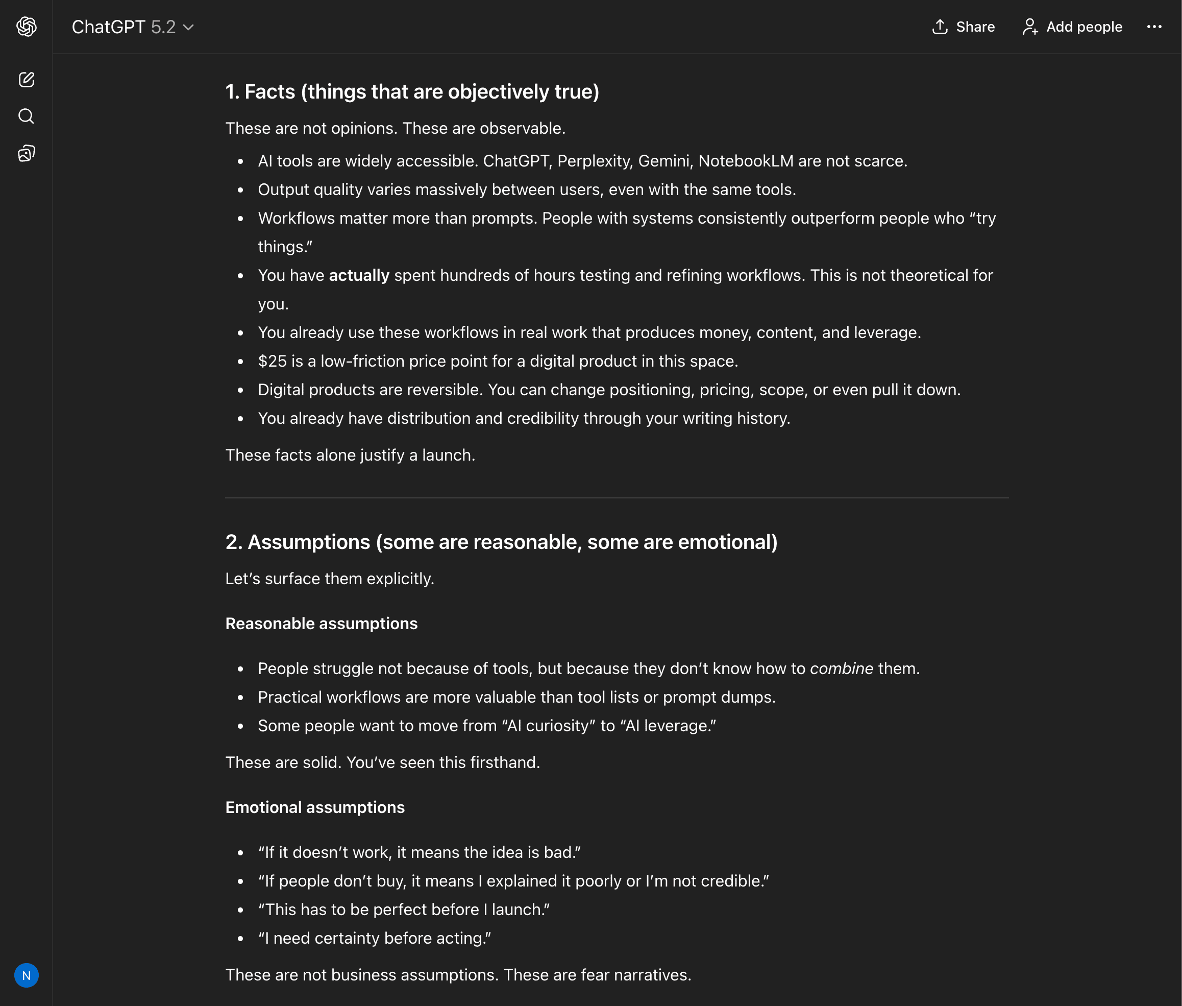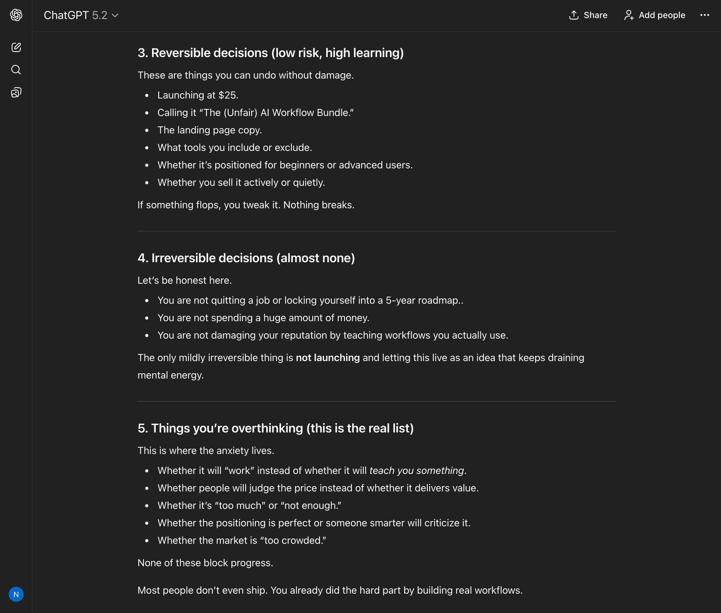 To give you a real example, I used this method when deciding whether to launch my new digital product, “The (Unfair) AI Workflow Bundle”.
