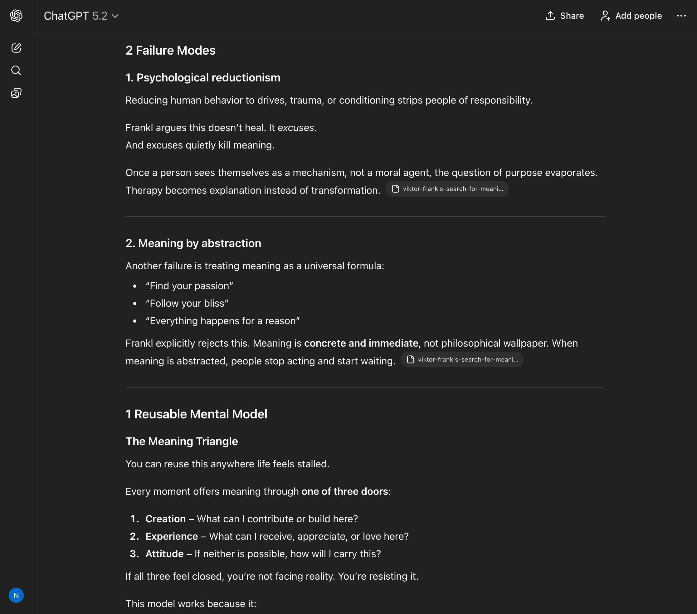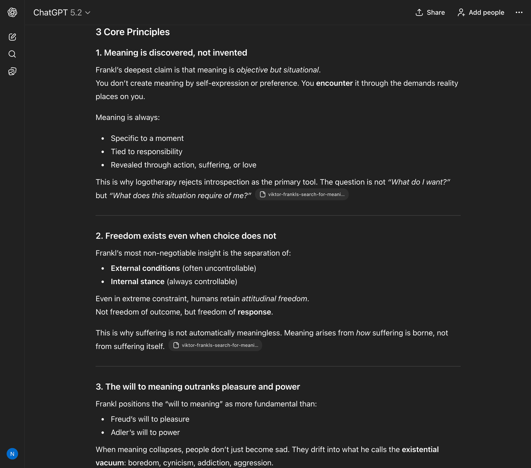 To give you an example, I uploaded the entire book “Man’s Search for Meaning by Viktor Frankl” and used the same prompt.