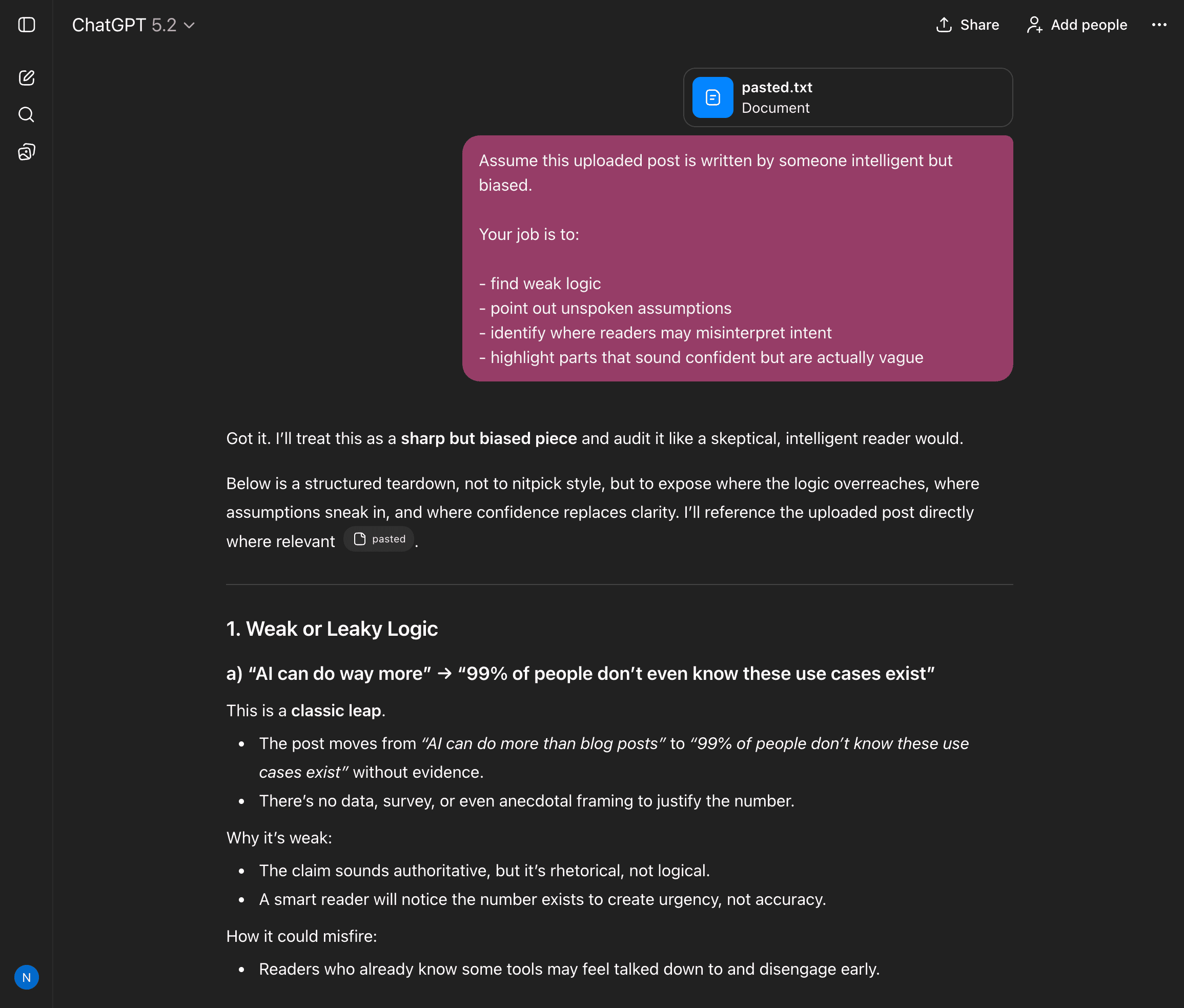 What do you mean? Well, before publishing anything important, I paste it into ChatGPT and ask: