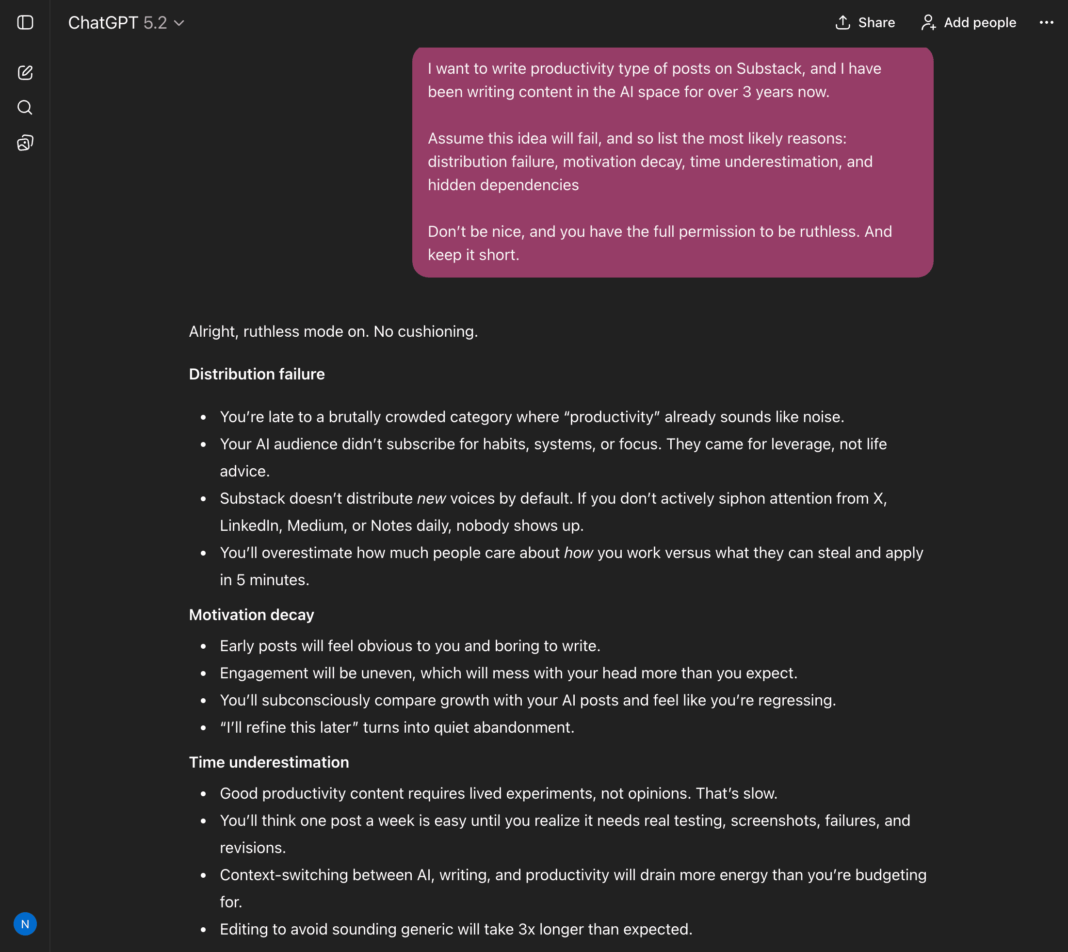 To do that, I upload my idea into ChatGPT and give it full permission to be ruthless.
