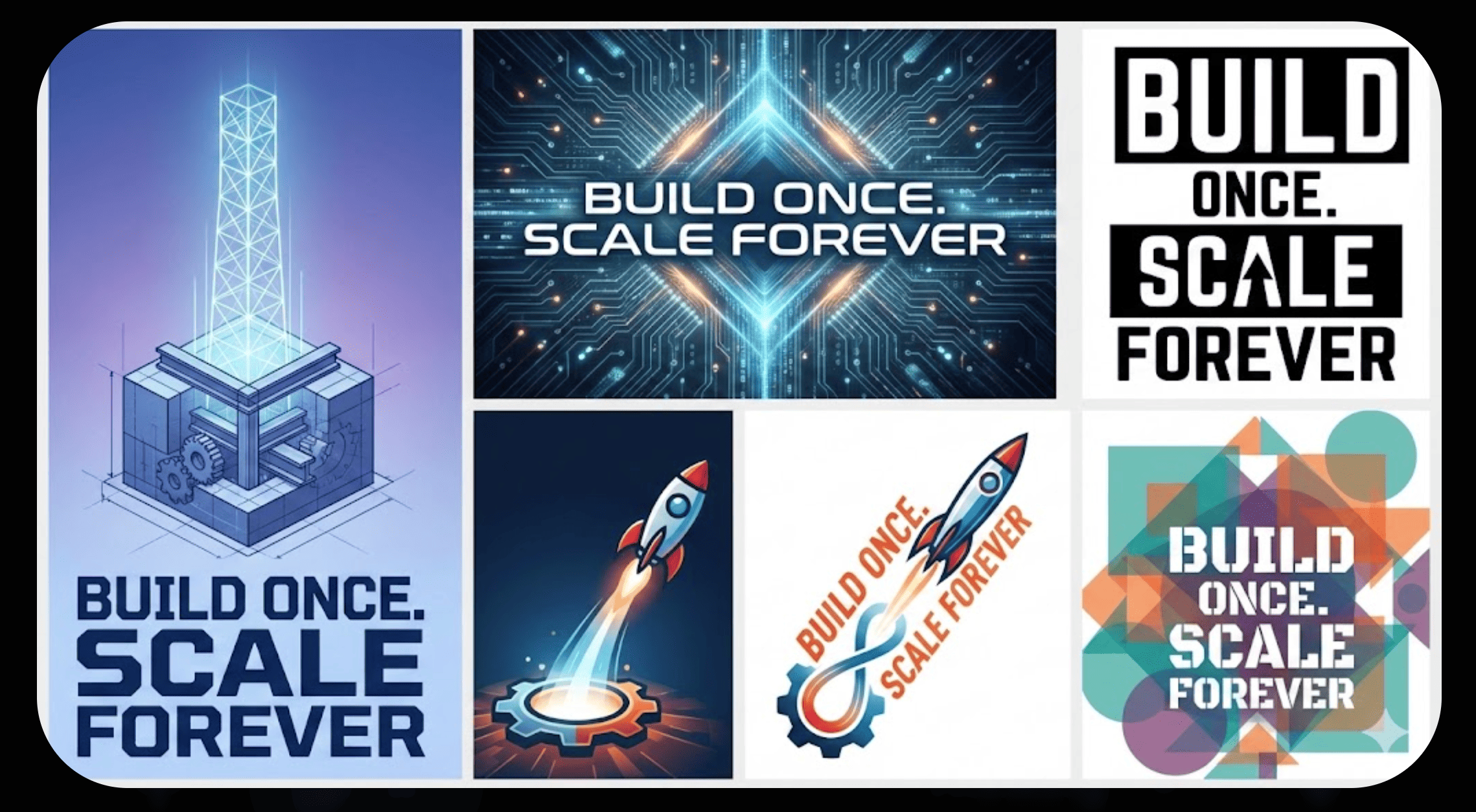 Create 5 poster-style variations using bold sans-serif typography. Here’s the headline: “Build Once. Scale Forever”.