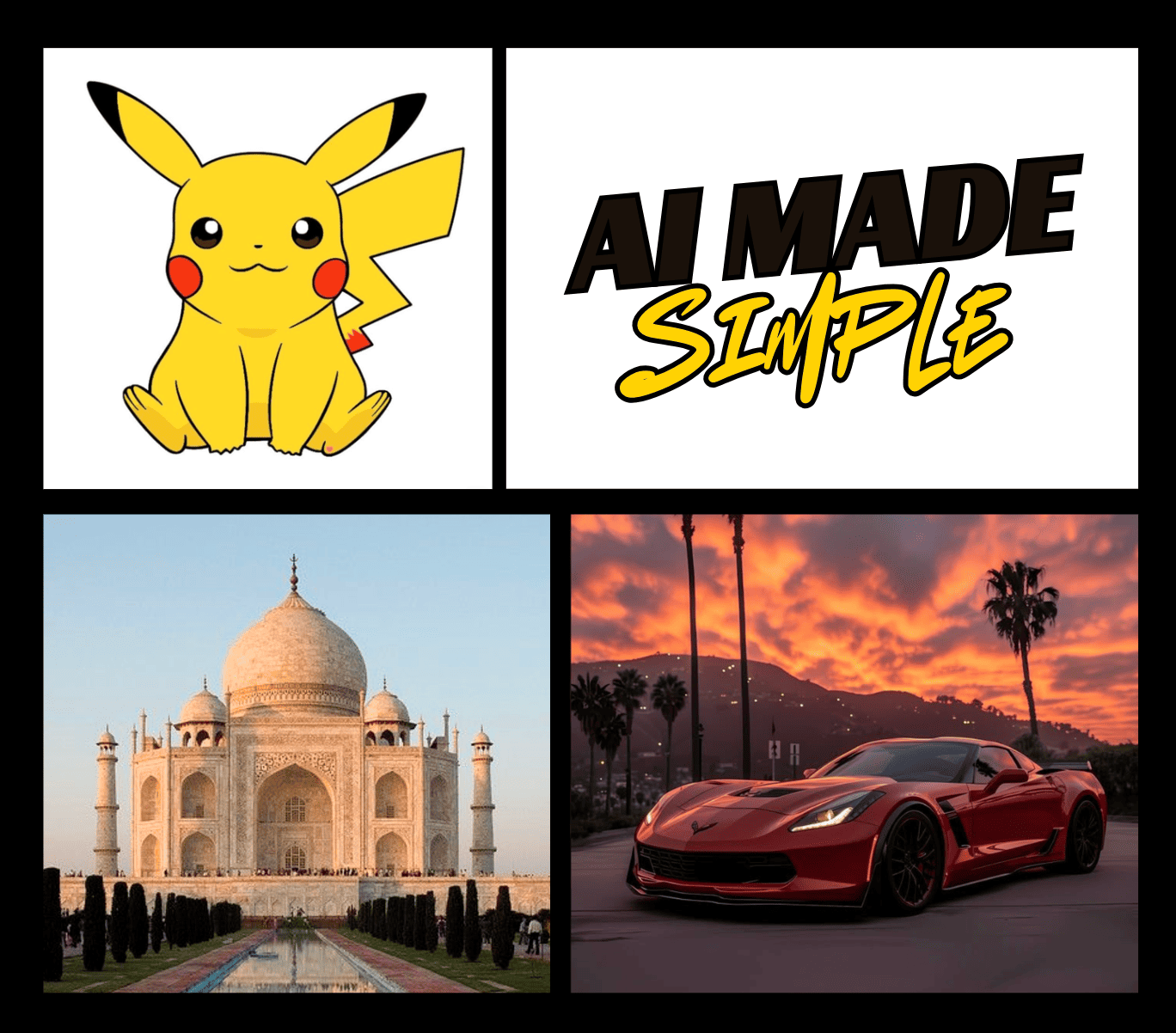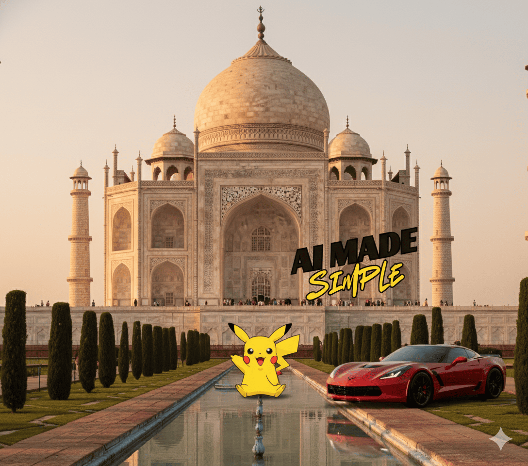 Create a single composite image using my uploaded photos. Place the Taj Mahal as the background. Put Pikachu in the center foreground, holding or pointing toward my ‘AI Made Simple’ newsletter logo as if promoting it. Position the car on one side (either left or right) in a natural way. Blend all elements smoothly with consistent lighting, shadows, and color tone so it looks like one cohesive scene.