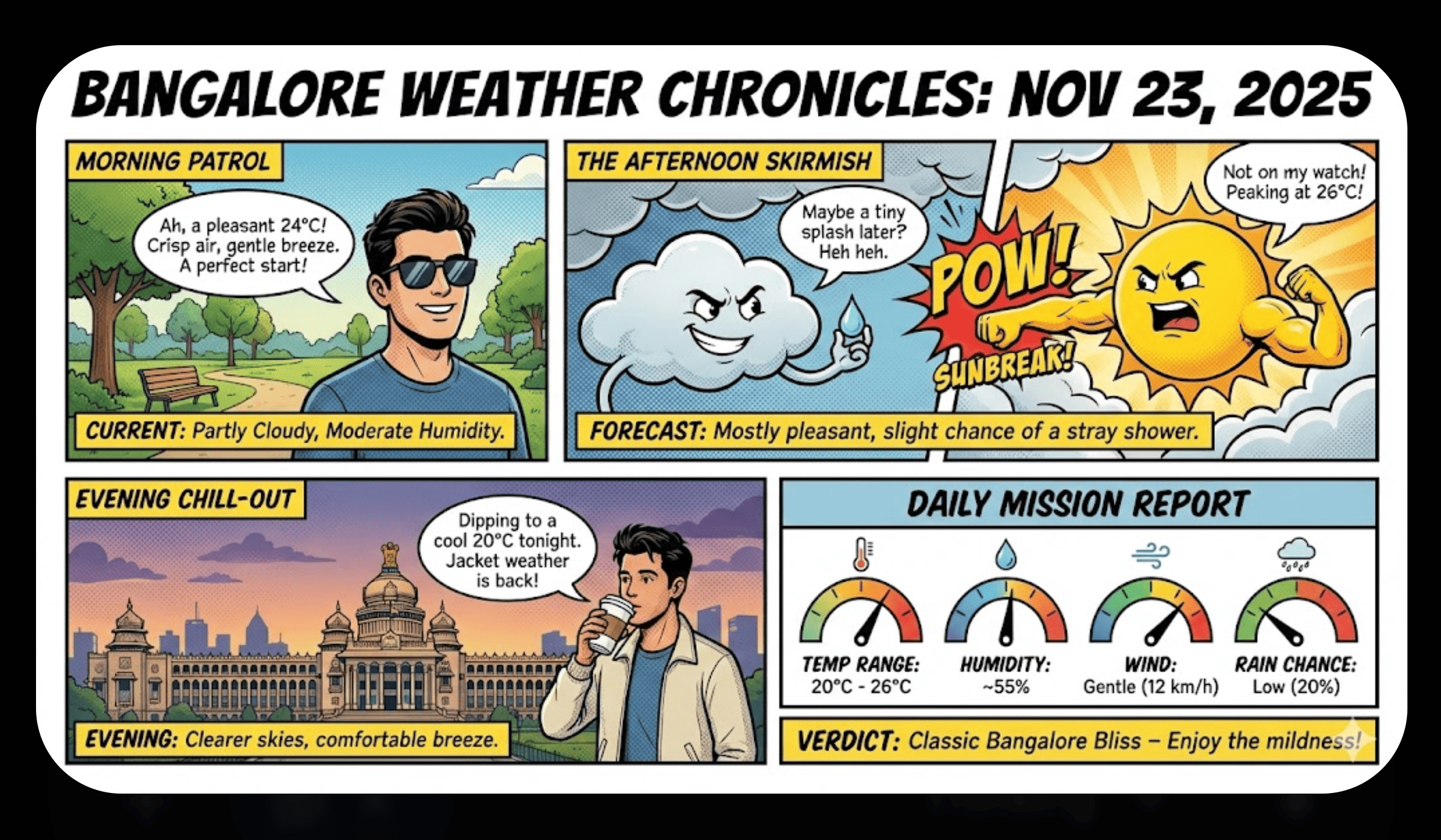 Create today’s weather in a comic-style infographic for Bangalore using realtime data.