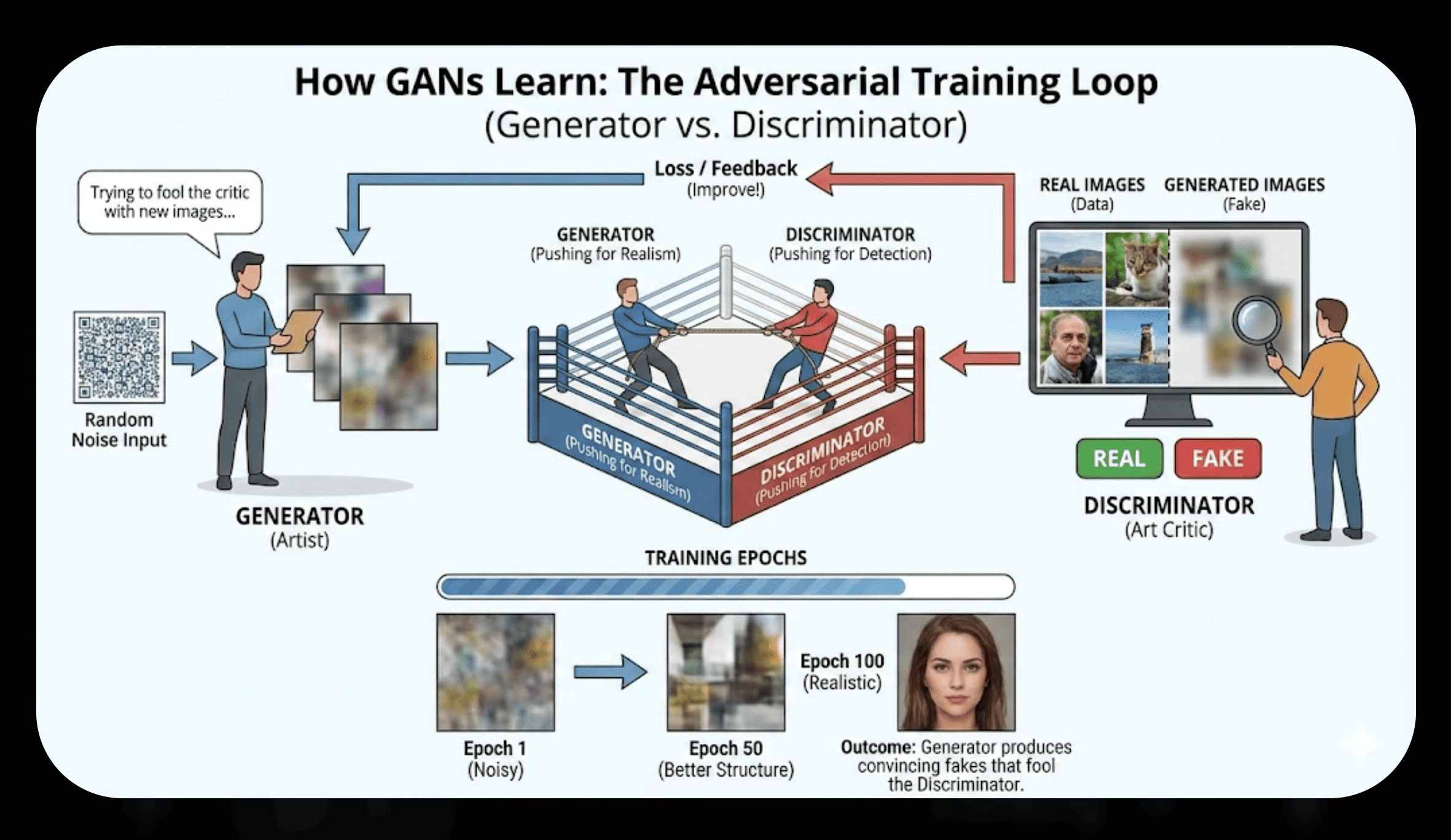 Explain GANs visually using an infographic. Focus on how the generator and discriminator fight each other and what happens during training.