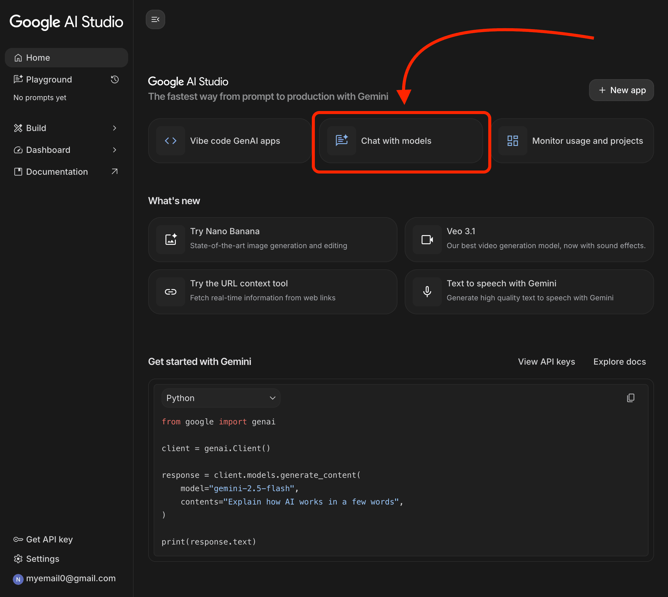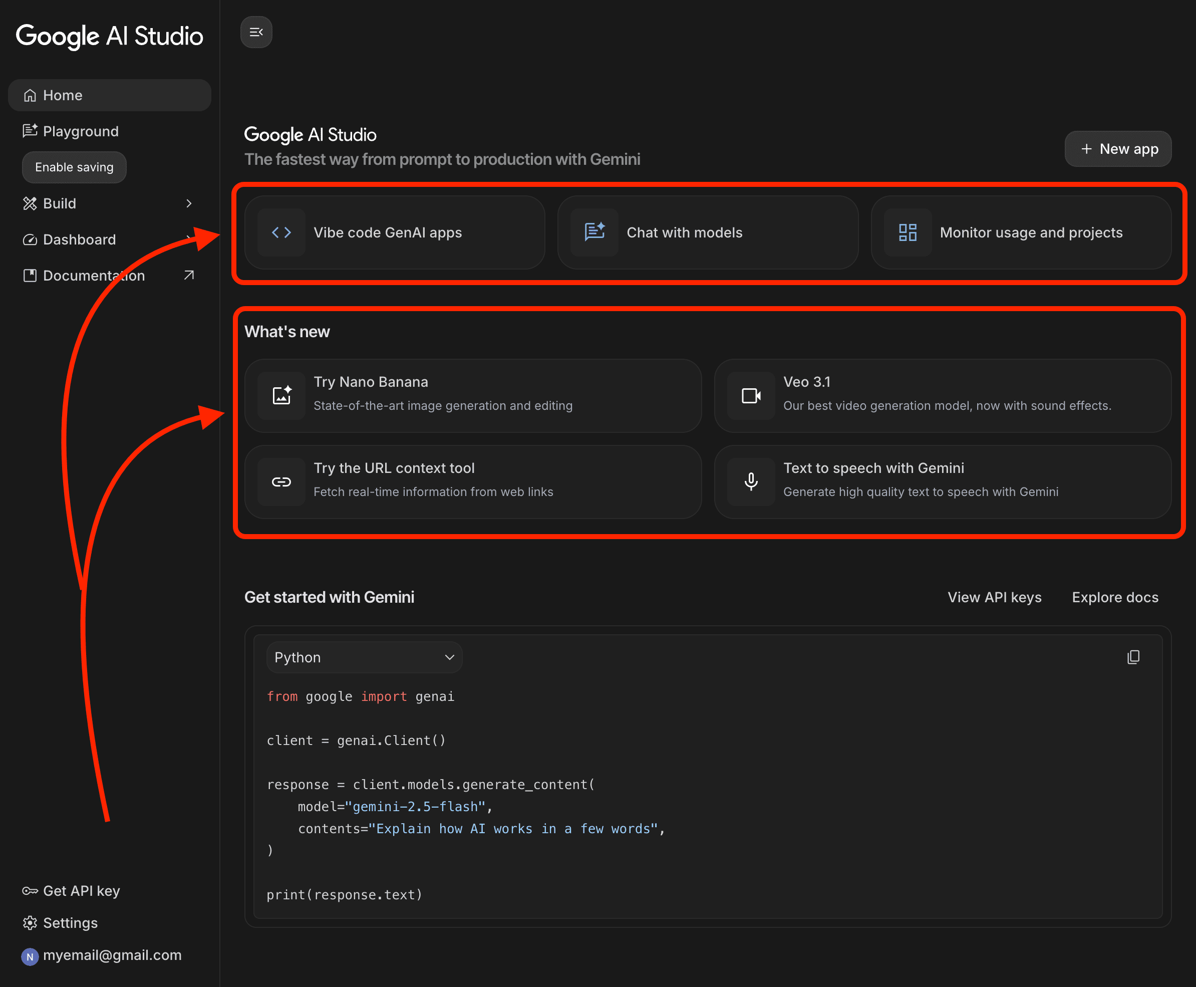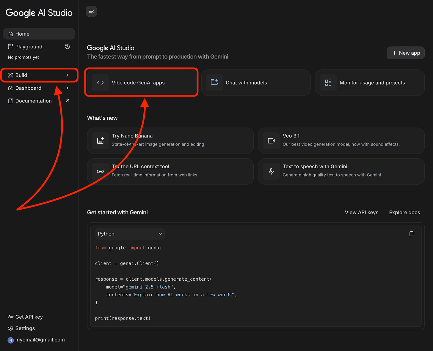 Then you can try almost every Google AI feature like chat with different Gemini models, use Nano Banana, explore Veo 3.1, build apps, generate high-quality text-to-speech, and more.