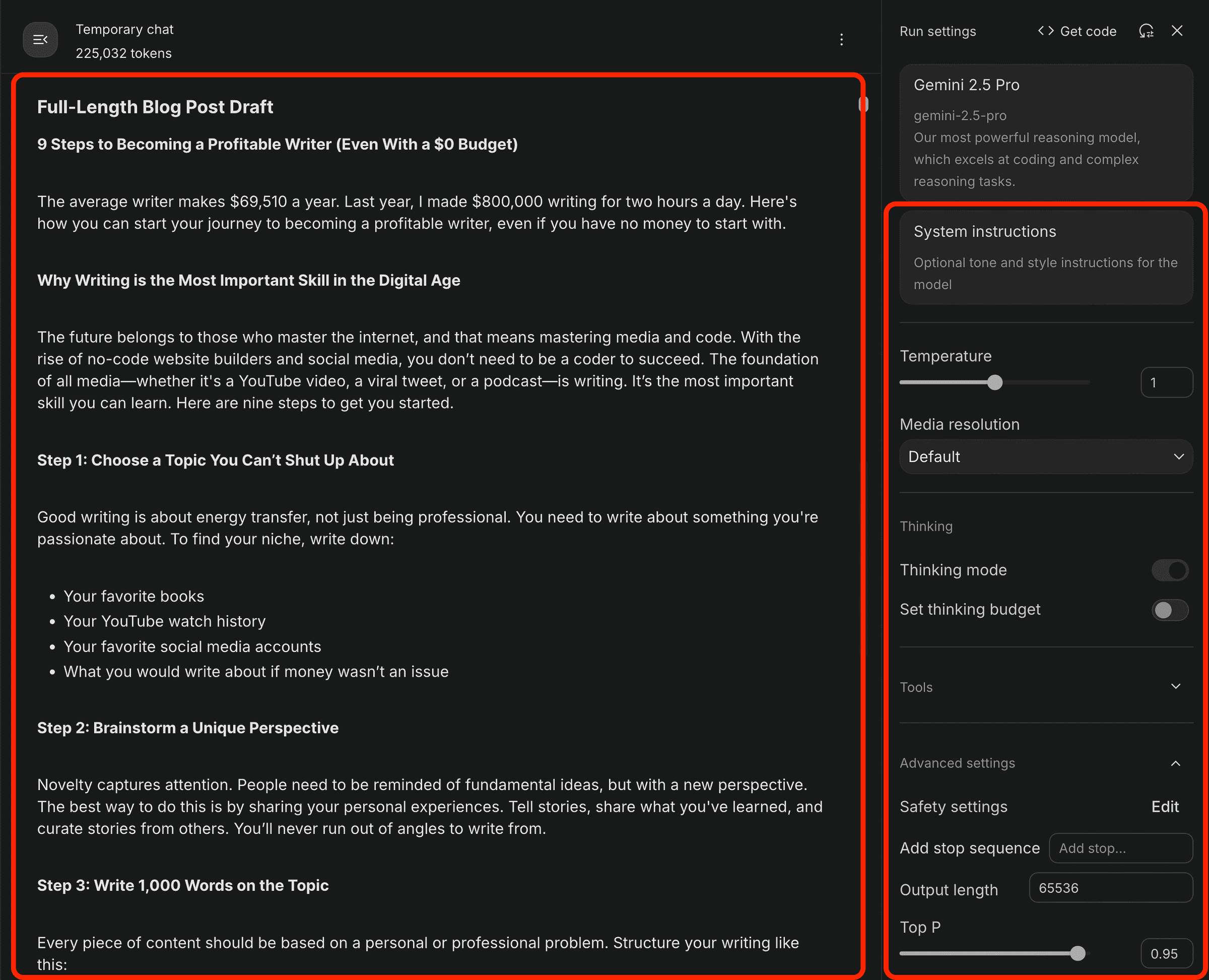 One more thing I’d add, for anyone using Gemini 2.5 Pro in AI Studio, try adjusting the context window and temperature settings for better control over code generation and reasoning quality. It will make a huge difference when generating content, building real apps or testing prompt chains.
