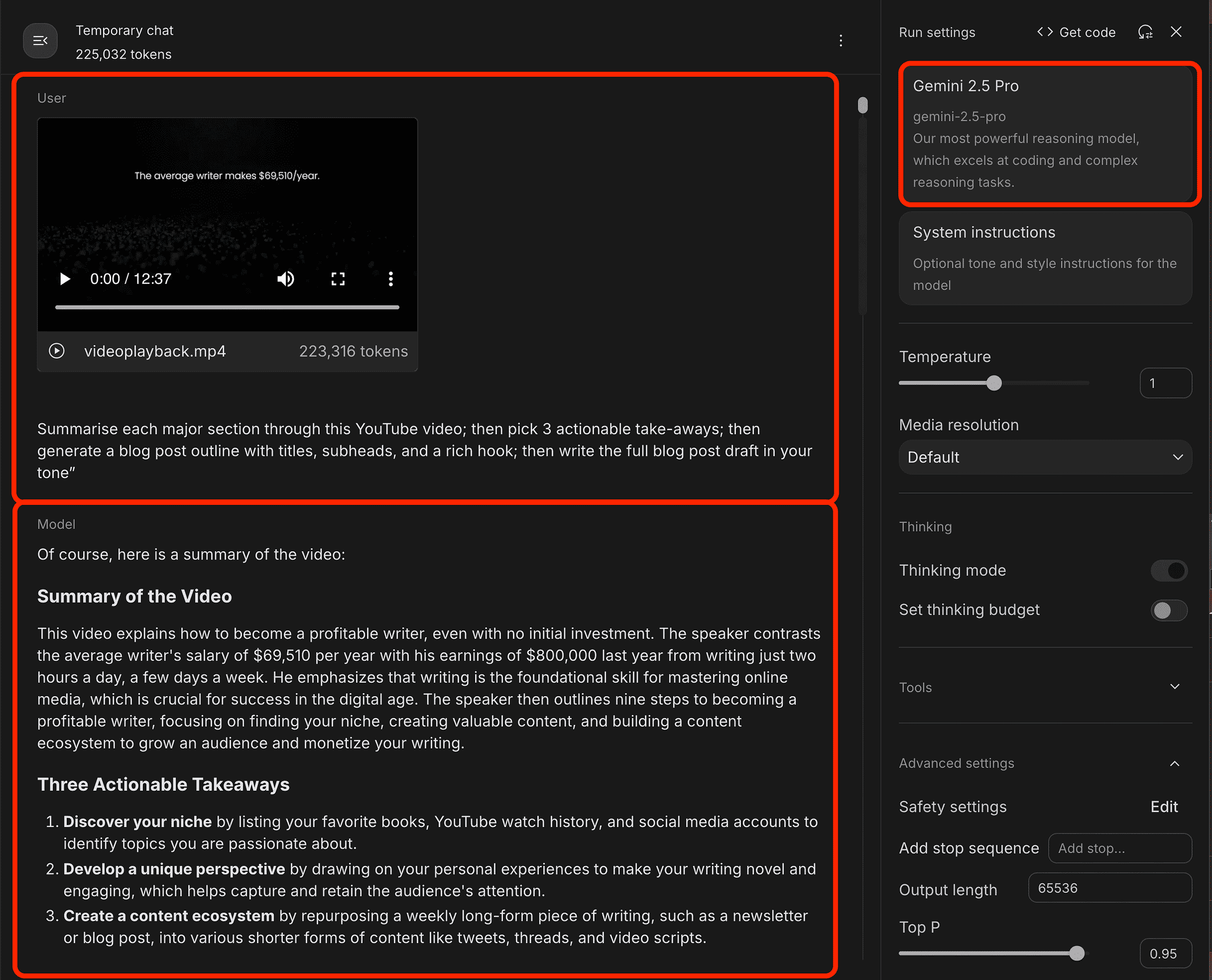 Then I asked the model: “Summarize each major section of this YouTube video; then pick 3 actionable takeaways; then generate a blog post outline with titles, subheads, and a strong hook; then write the full blog post draft in your tone”.