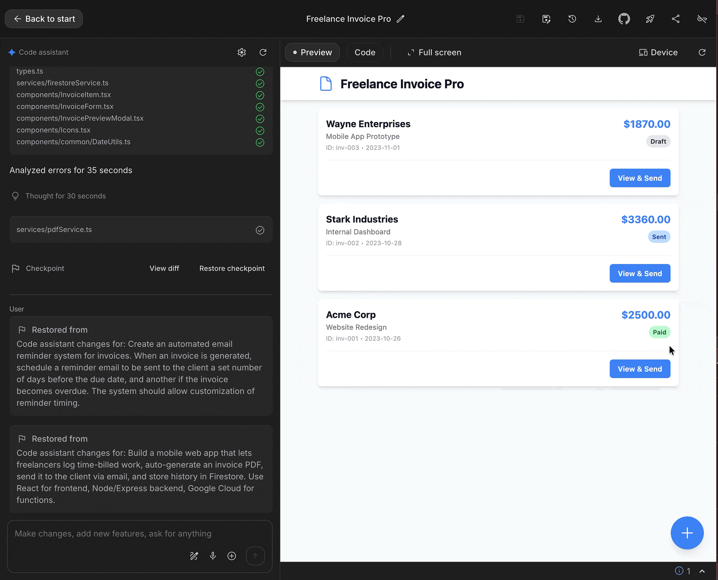 Build a mobile web app that lets freelancers log time-billed work, auto-generate an invoice PDF, send it to the client via email, and store history in Firestore. Use React for the frontend, Node/Express for the backend, and Google Cloud for functions.