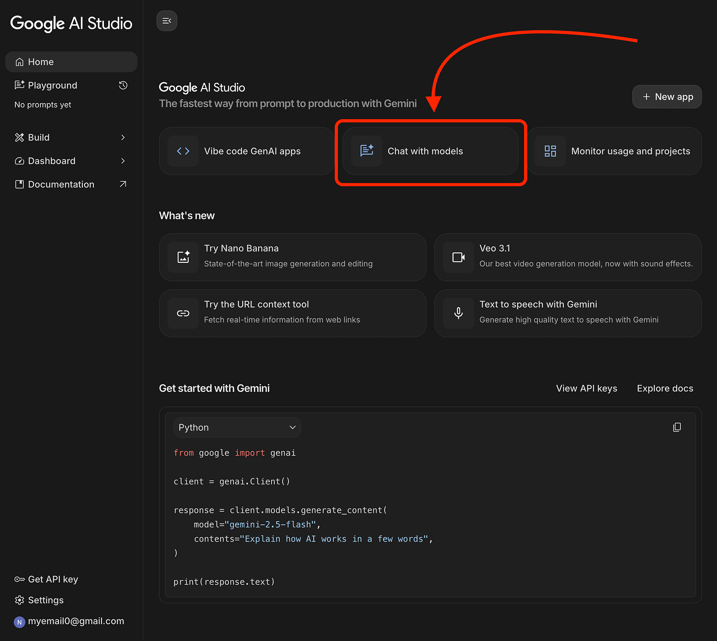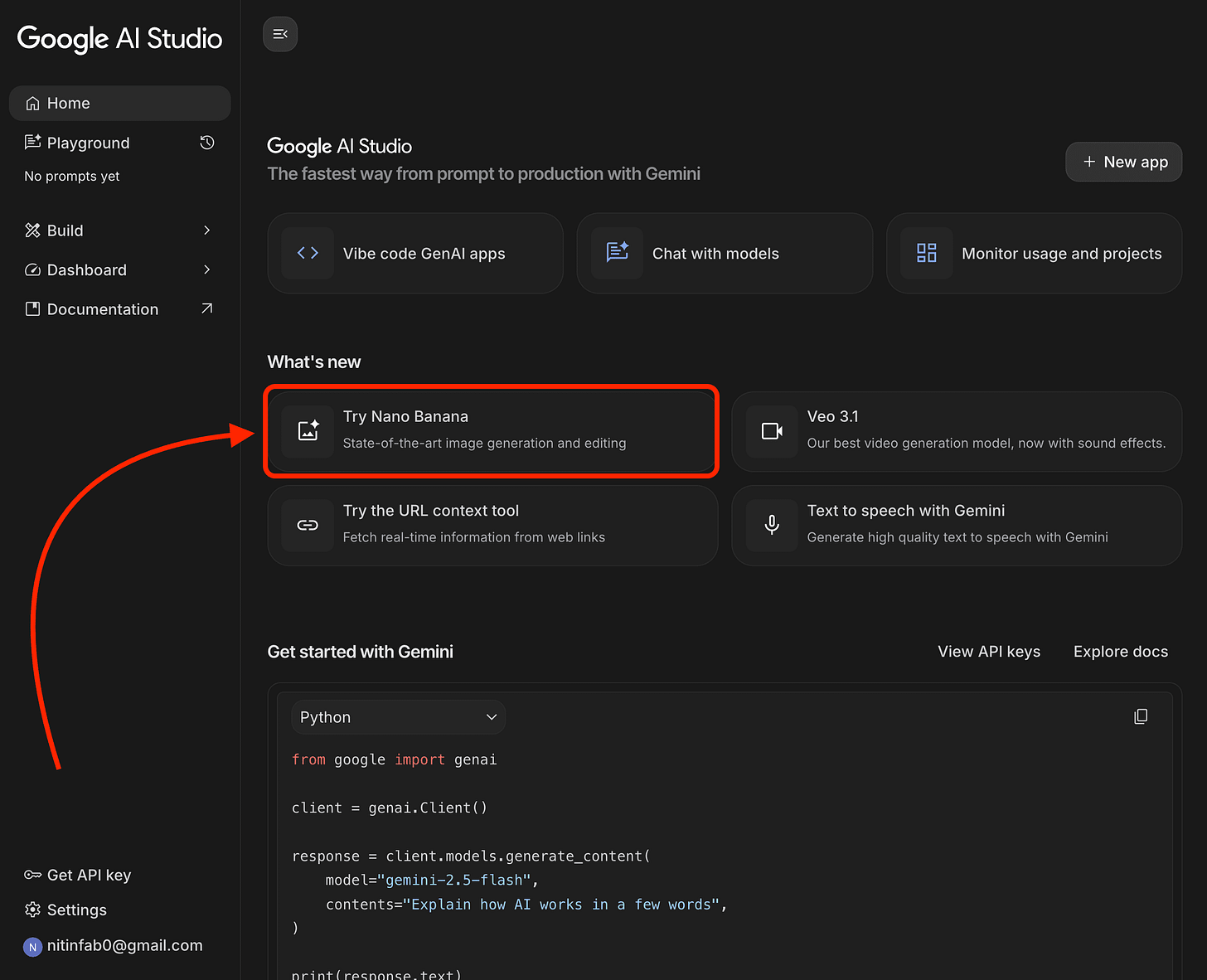 In short, it’s your AI workspace where you can test prompts, build apps, generate images with Nano Banana, use Veo 3 to generate videos, create high-quality text-to-speech, switch between Gemini models, refine your ideas, and export everything as code.