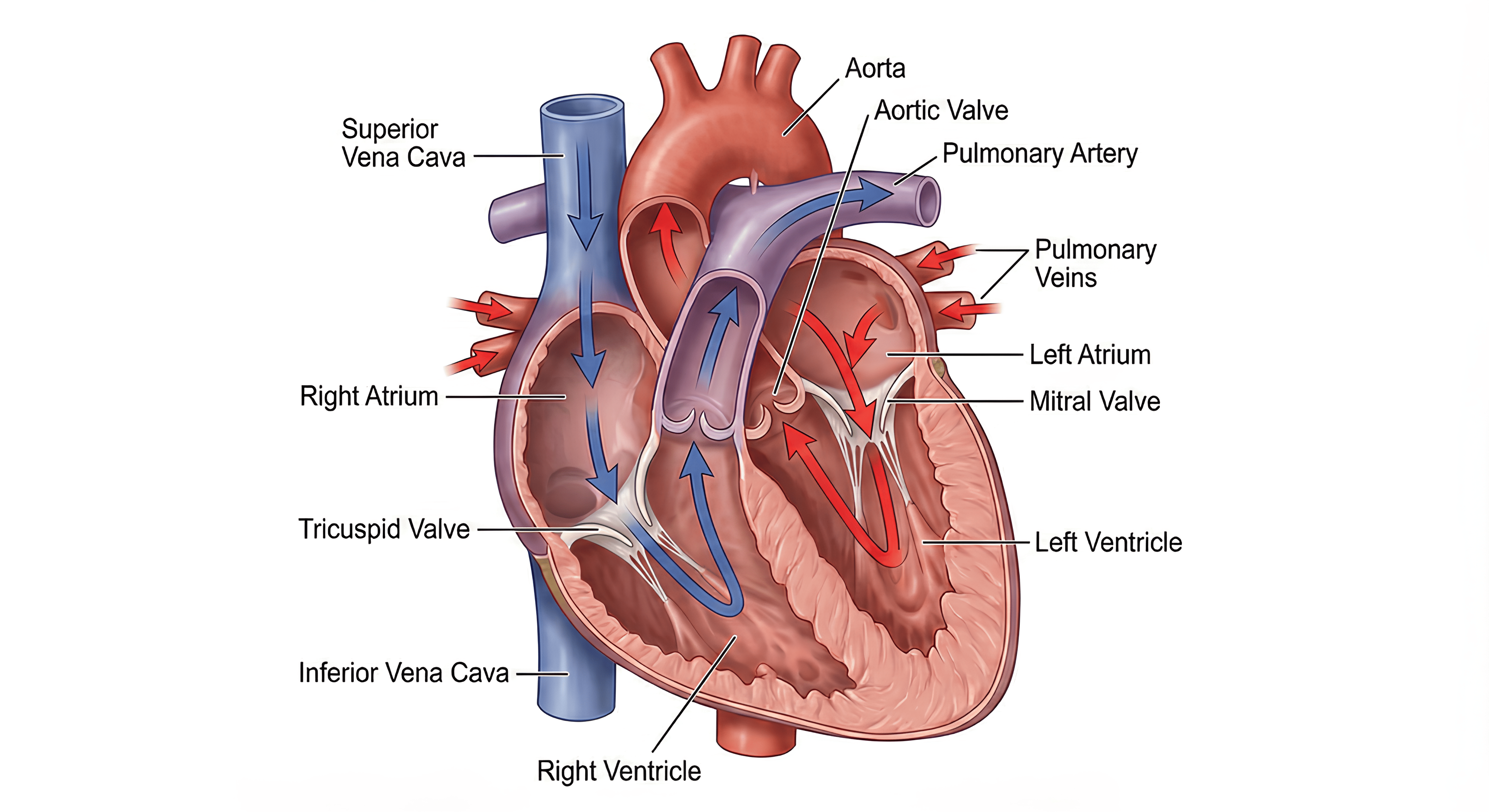 Here’s another prompt I tried: Act as a professional medical illustrator. Create a high-fidelity, coronal cross-section diagram of the human heart to illustrate the cardiac cycle. Visually distinguish between oxygenated (bright red) and deoxygenated (deep blue) blood flow using subtle, semi-transparent directional arrows. Accurately render the four chambers (atria and ventricles) and the major valves (mitral, tricuspid, aortic, and pulmonary). Ensure the muscular wall thickness of the left ventricle is anatomically thicker than the right. The style should be clean, educational, and suitable for a university-level anatomy textbook, set against a pure white background, and label them correctly.