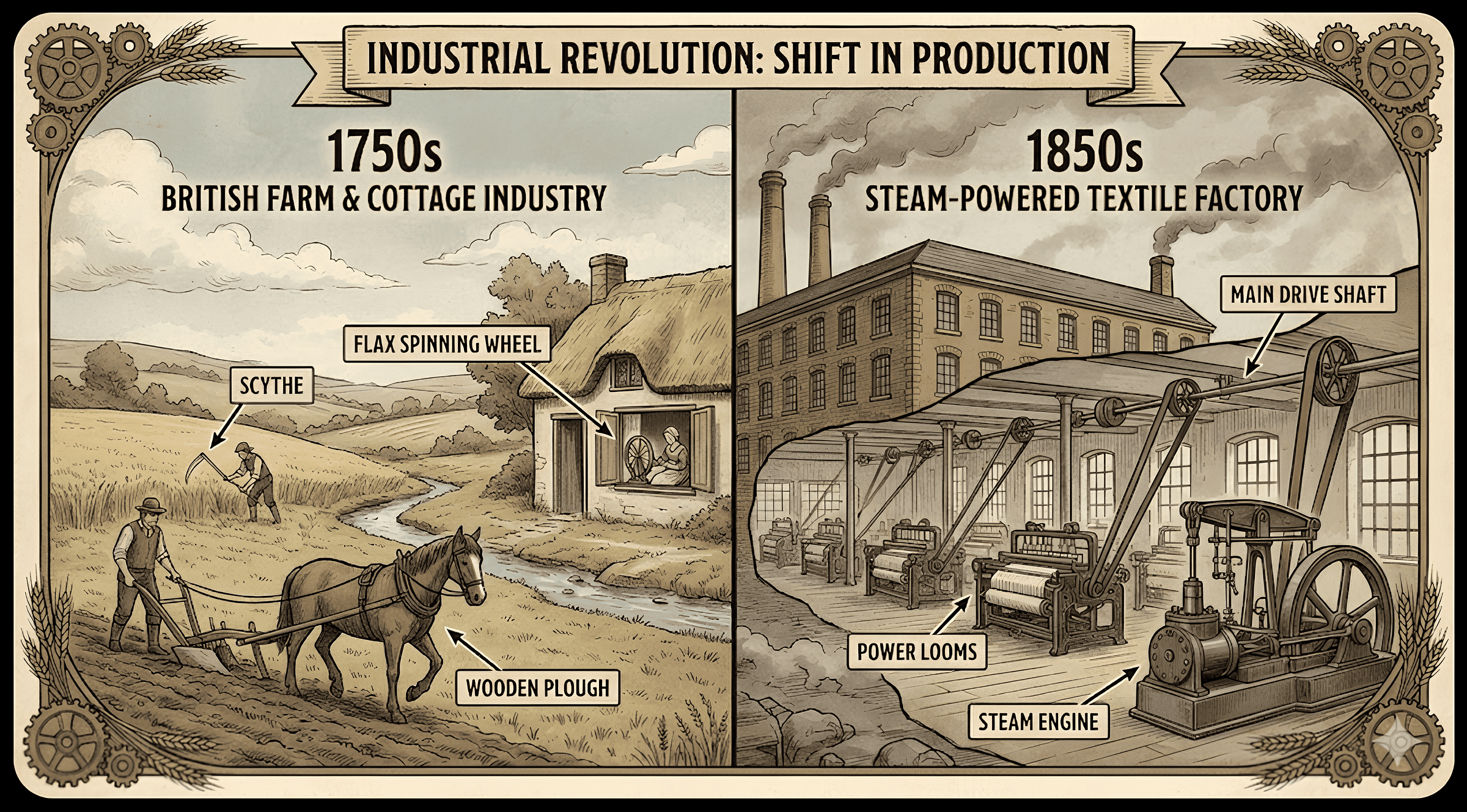 Here is the prompt I tried: Create a split-screen educational infographic. Left side: A 1750s British farm. Right side: A 1850s steam-powered textile factory. Label the key tools in both images (e.g., ‘Spinning Jenny’, ‘Steam Engine’) with clear text arrows. Use a muted, historical textbook illustration style.