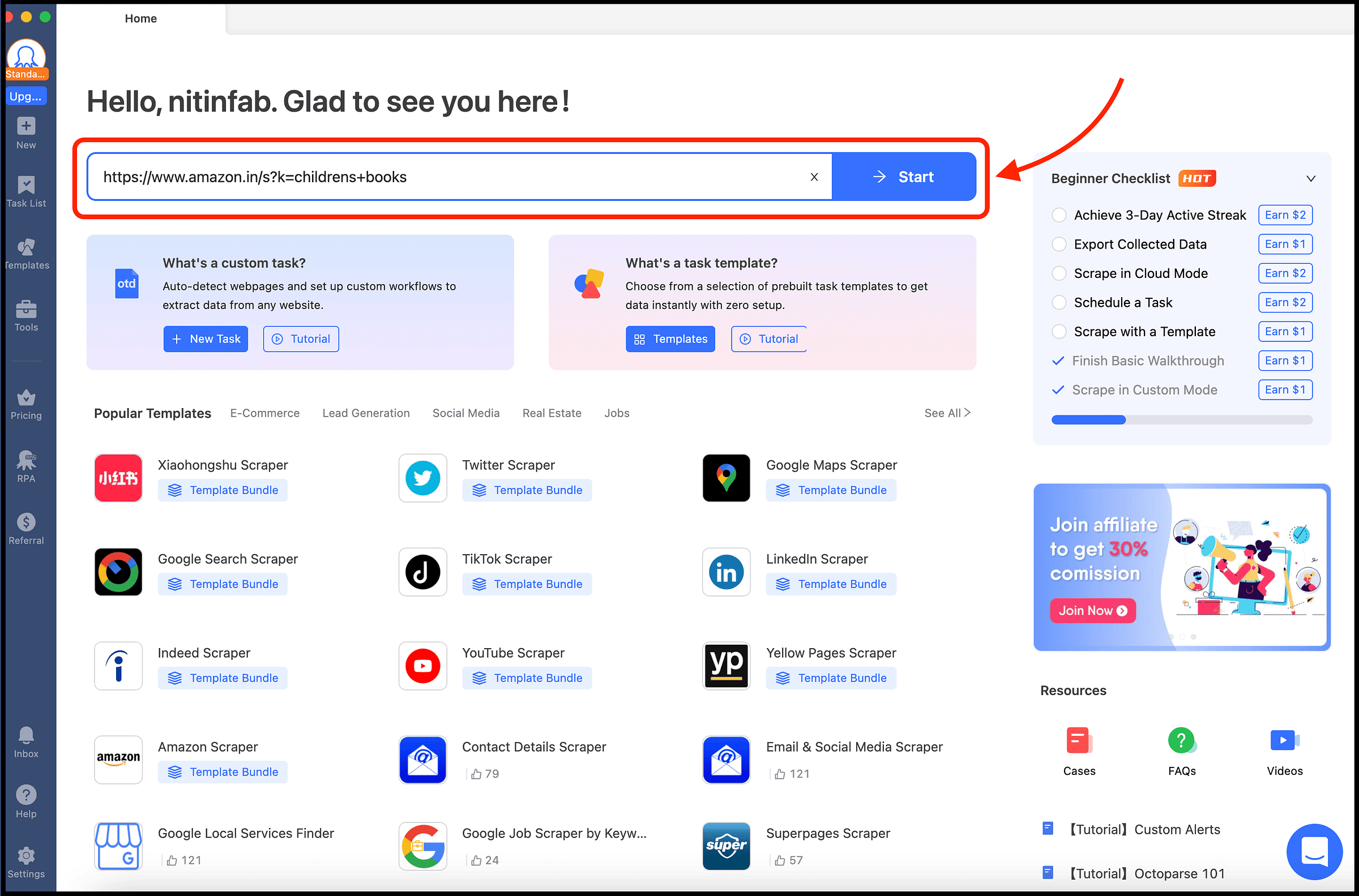 When you open the app, you can start by adding the specific URL to scrape data, and proceed further. Even it has multiple tutorials and several popular templates to make things even easier.