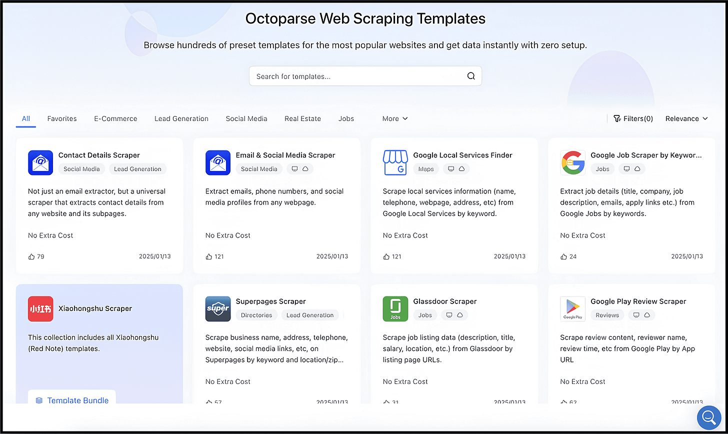 They have a number of prebuilt task templates for literally everything — from scraping contact details to Amazon, YouTube, Twitter, Google Maps, and more.