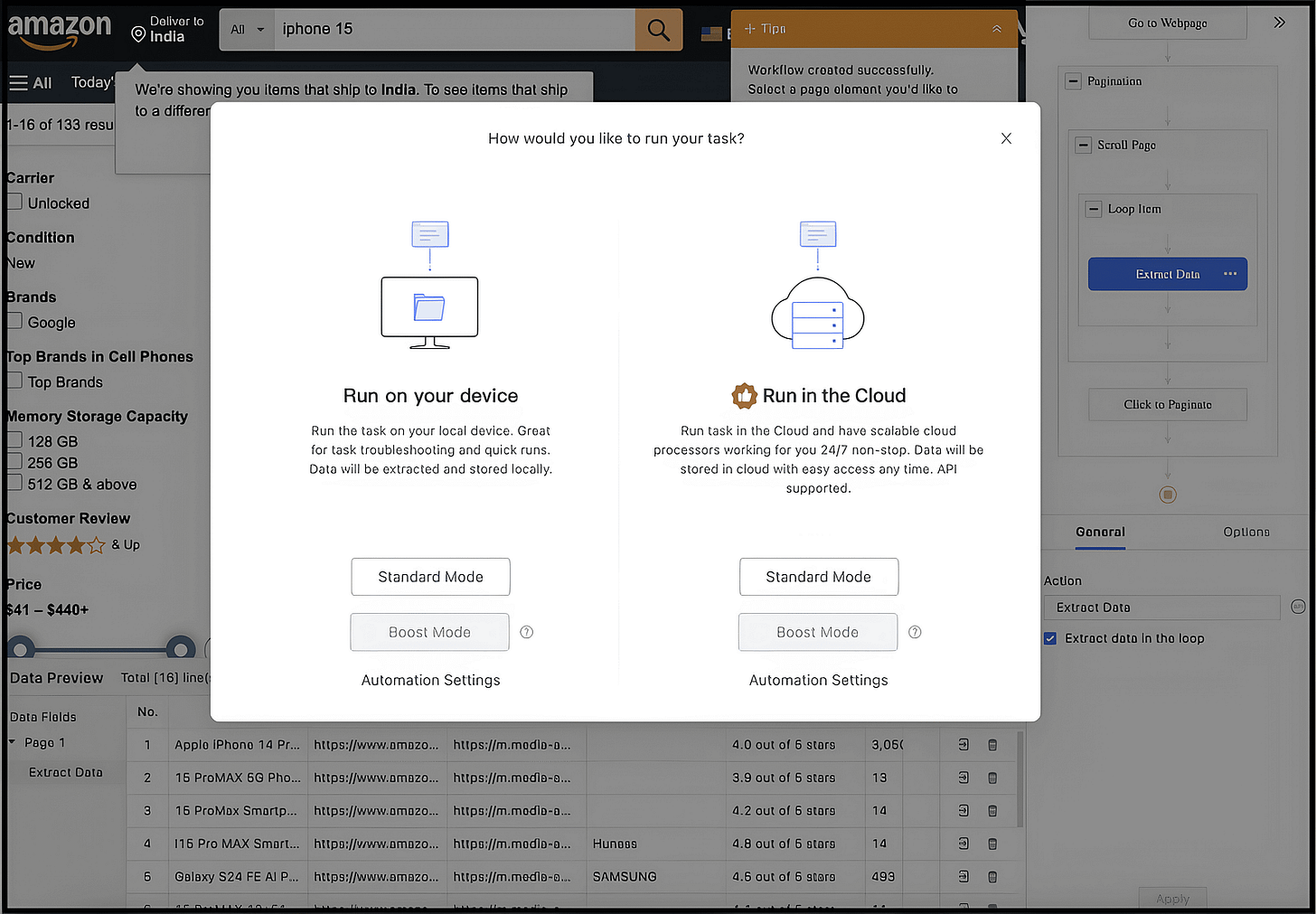 Now, after creating the workflow, you can either run the task locally on your device or in the cloud.