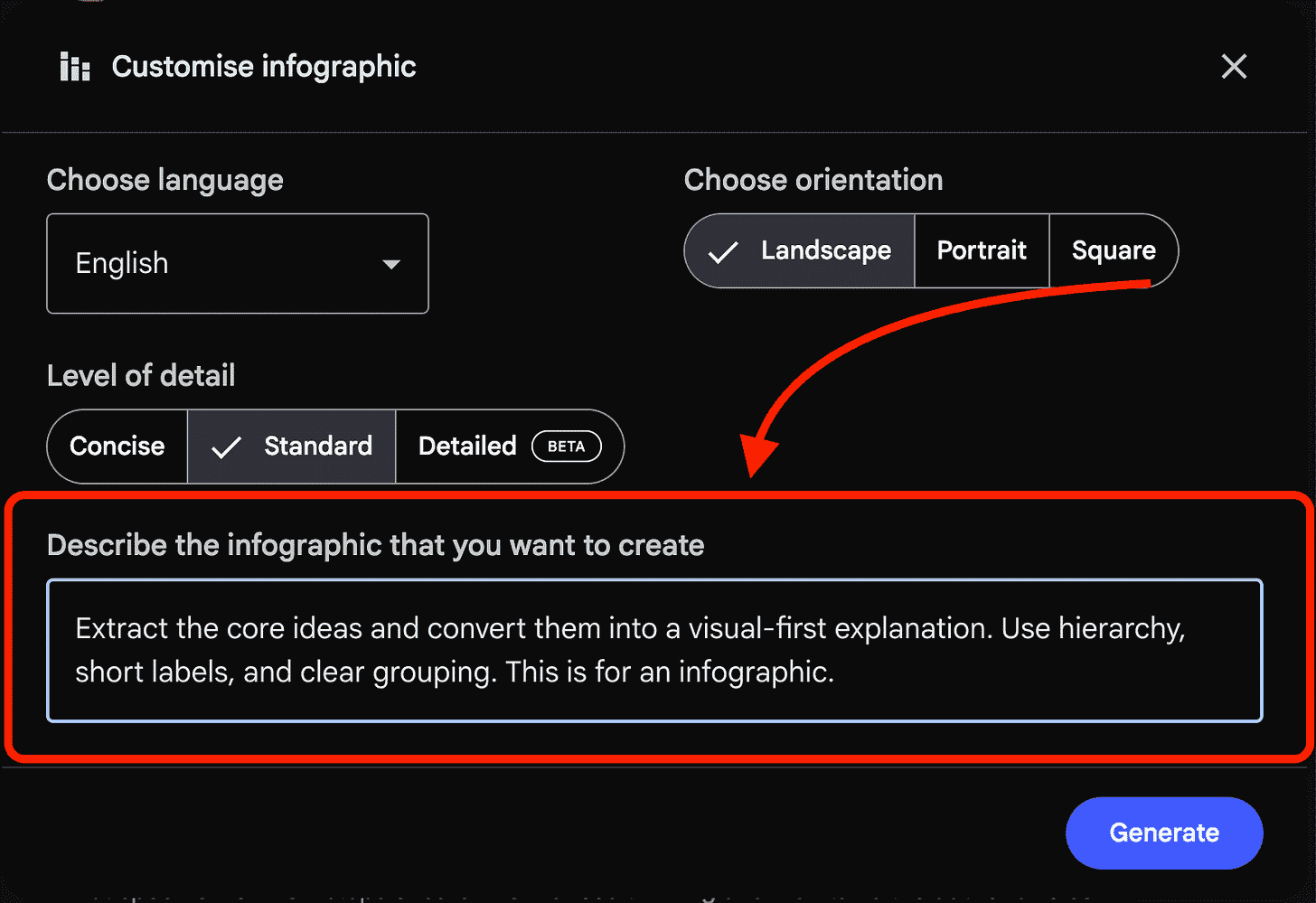 I don’t use generic prompts like “Explain this better in an infographic”.