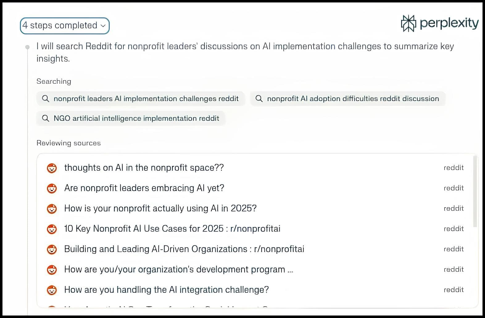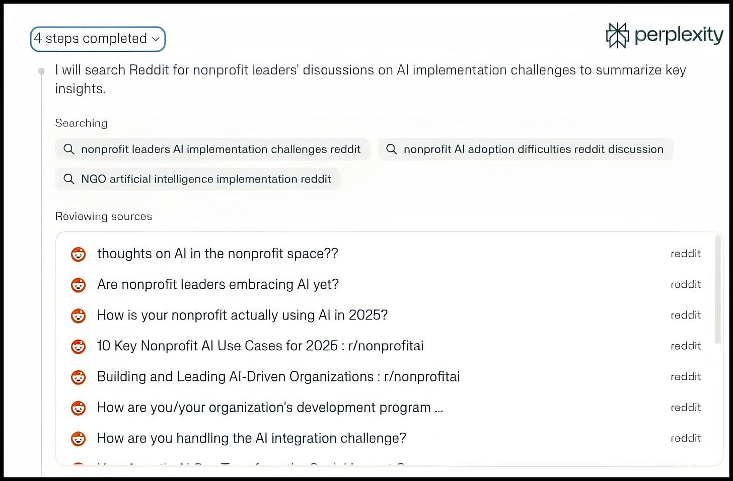 Last week, I wanted to write about AI implementation for nonprofits. So I asked Perplexity: “What are nonprofit leaders saying about AI implementation challenges on Reddit?”