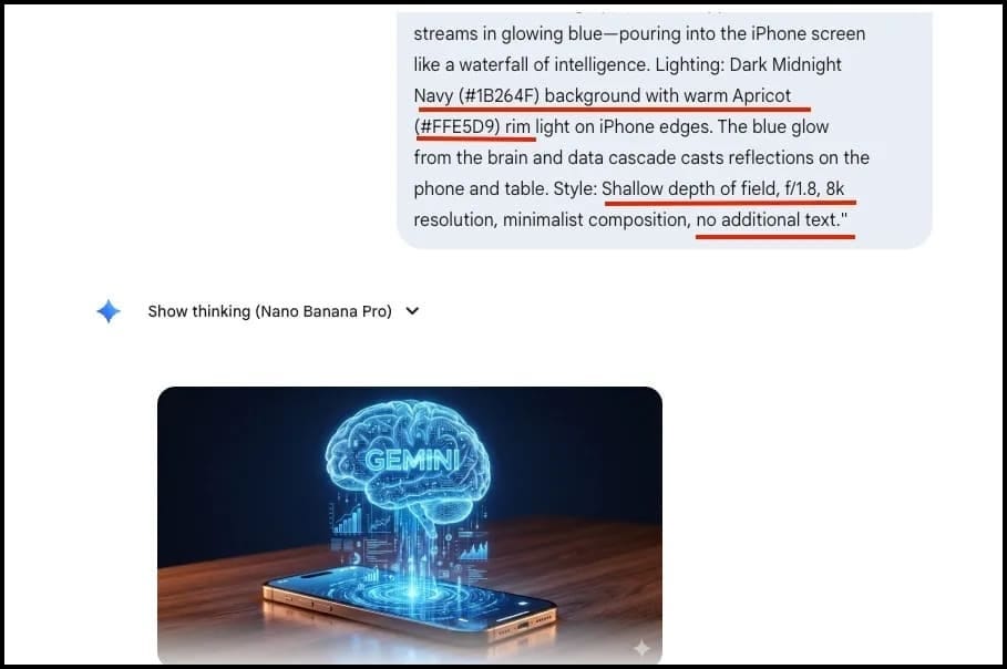 If the first result isn’t quite right, I don’t start over. I just say “make the blue circuitry more subtle” or “move the light source to the left” and Gemini adjusts while maintaining everything else.