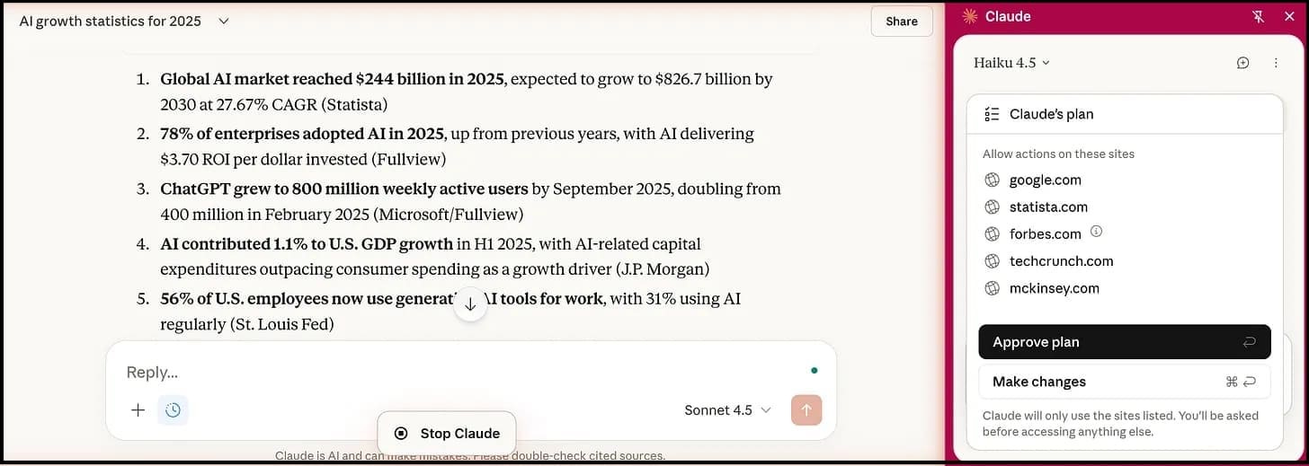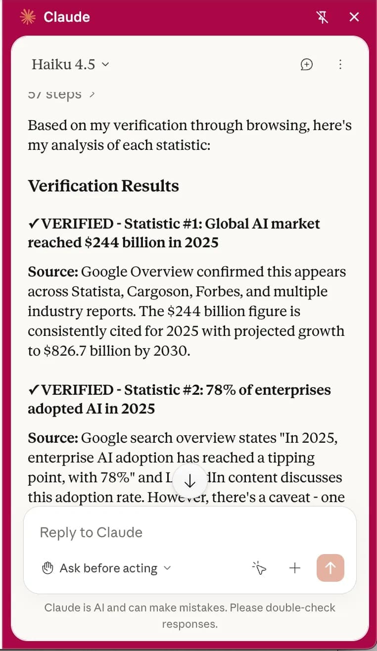 Every article includes statistics, quotes, and specific claims. Before I discovered Claude’s Chrome extension, I fact-checked manually by visiting each source, taking screenshots, comparing my claims to the original text.