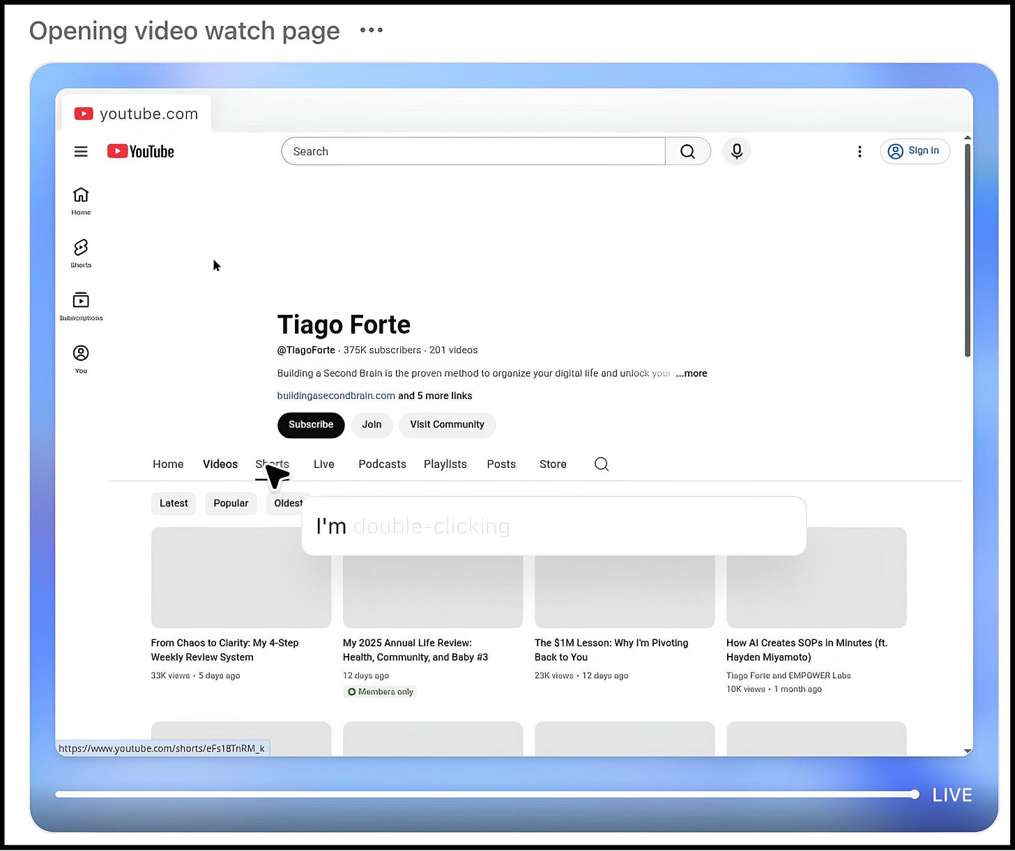 I give my agent a topic and 5-10 YouTube channel names. It visits each channel, pulls recent video titles and descriptions, identifies common themes, finds gaps nobody’s covering, and outputs a research brief with links to specific videos worth watching.