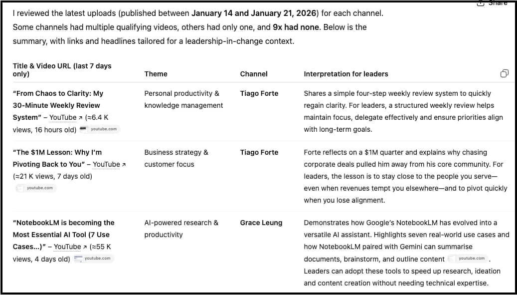 Last week, I asked it to research “AI leadership content from the past 30 days” across 8 competitor channels. It ran for 15 minutes while I made coffee. When I came back, I had a complete brief showing: